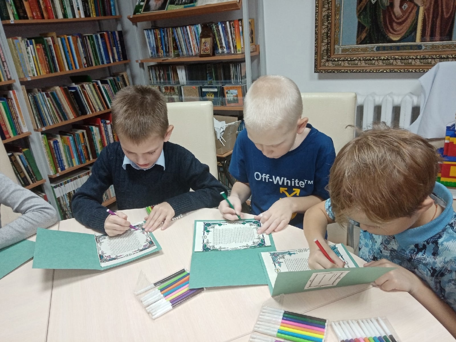 На занятии творческого объединения "Азбука Православия" ребята своими руками сделали открытки, в которых написали молитву святителю Иоанну Тобольскому - Сибирскому чудотворцу для наших воинов.
