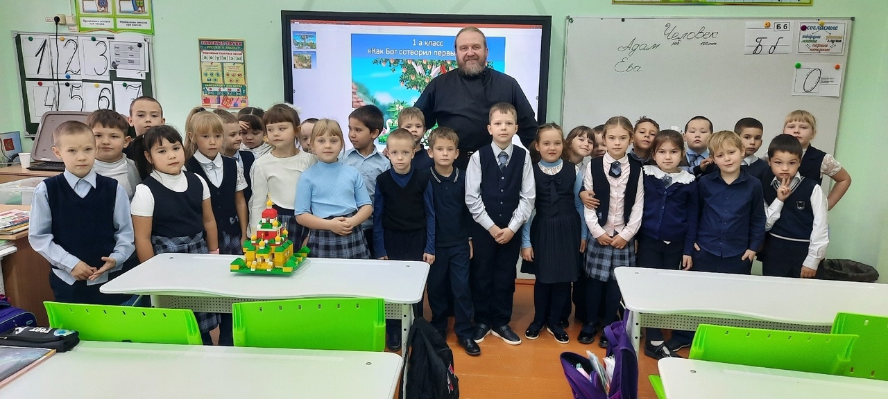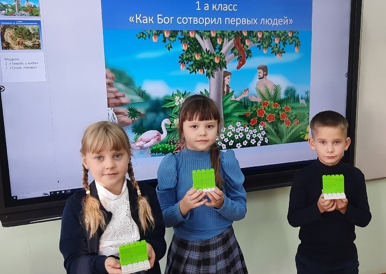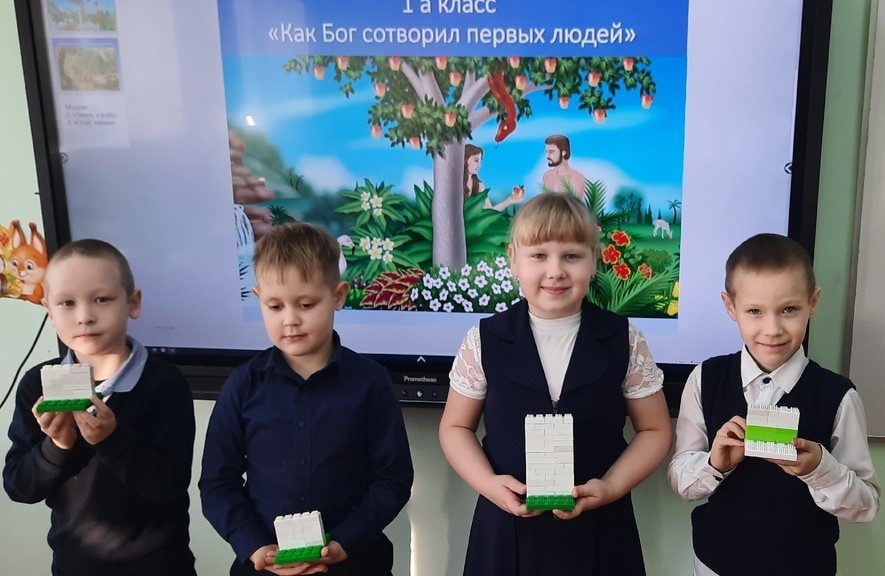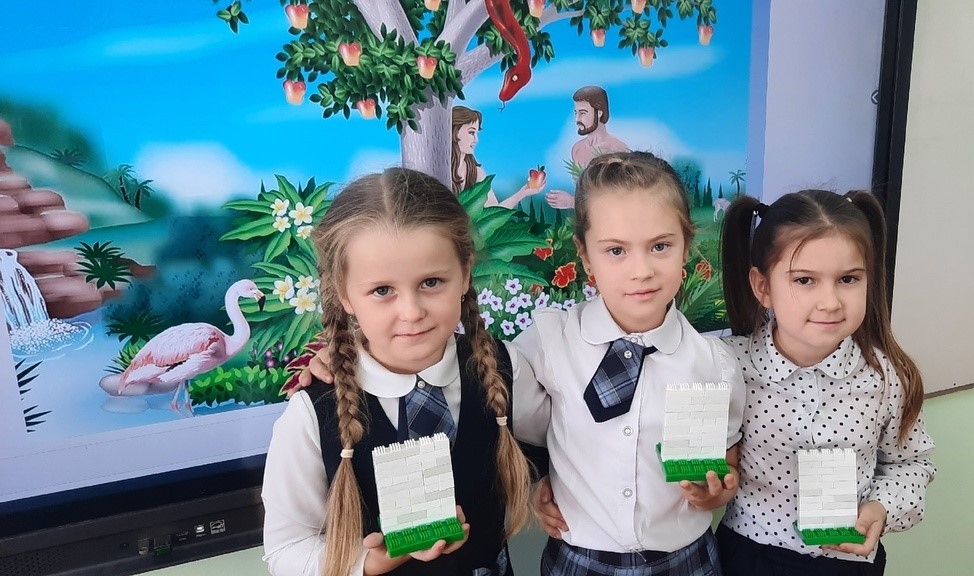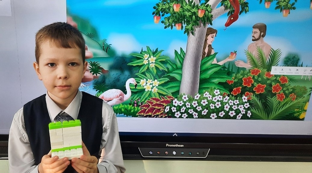 На занятии дети узнали историю о сотворении первых Людей Адама и Евы и о их жизни в раю. Это уже шестой день творения мира. А модель, которую дети конструировали из лего - это твердь и вода. Твердь значит небо. Эти модели соответствуют второму дню творения мира, когда Бог отделил воду от небесной тверди. После изобретения модели тверди ребята с удовольствеим сконструировали вместе с батюшкой многокупольный Храм!