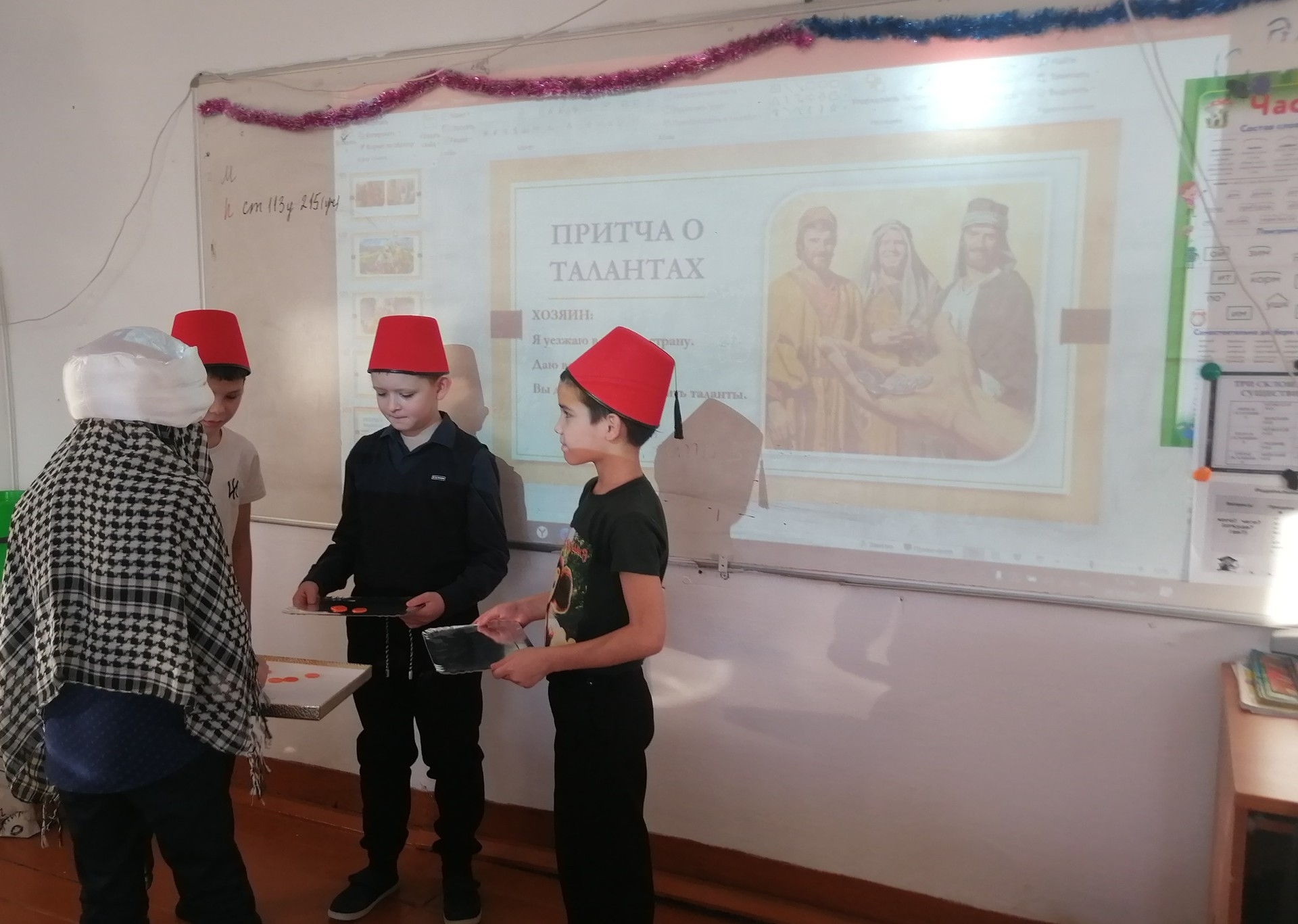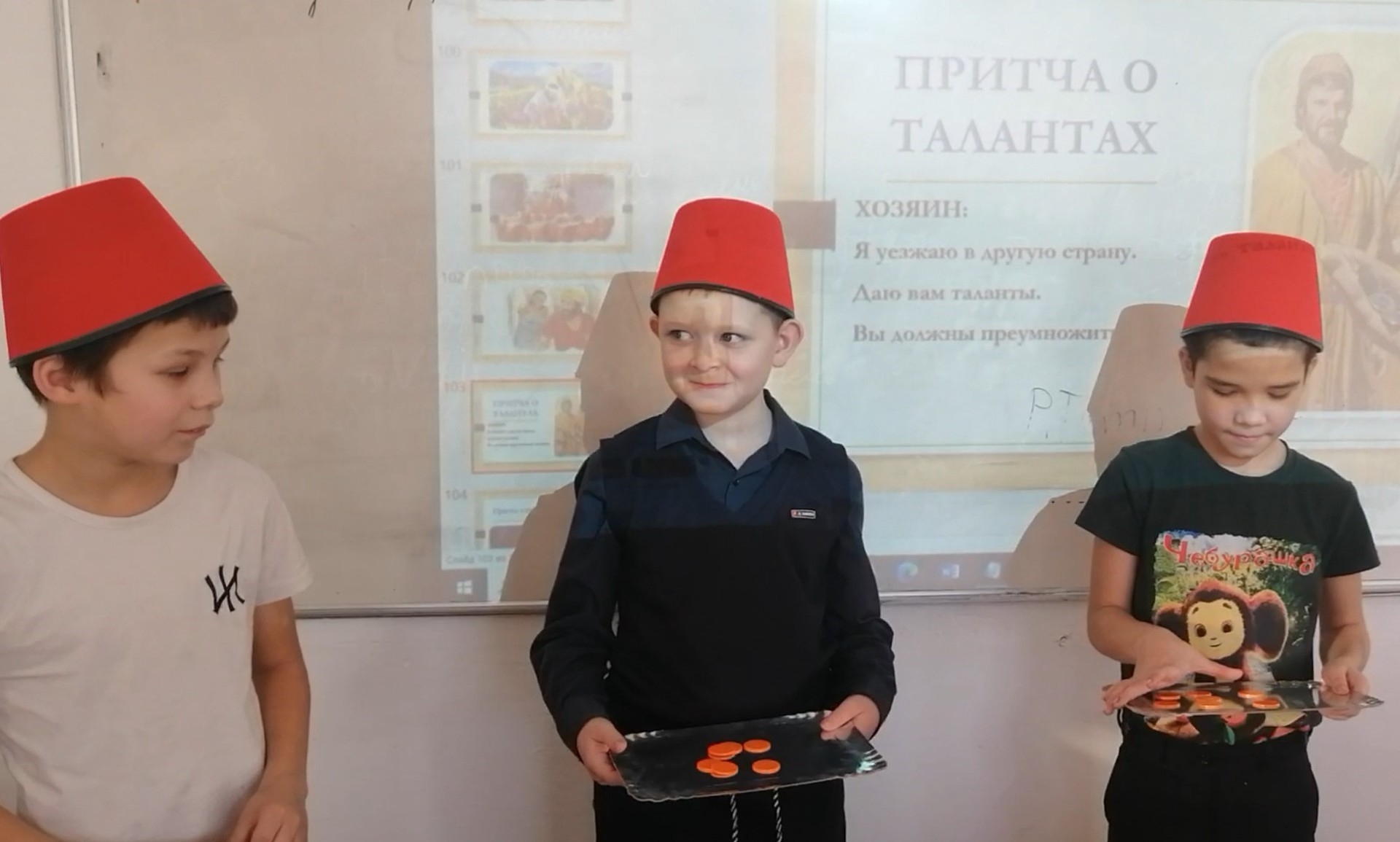 На занятии детям предстояло познакомиться с содержанием притчи "О талантах", а затем, распределив роли, представить театрализацию притчи классу.
