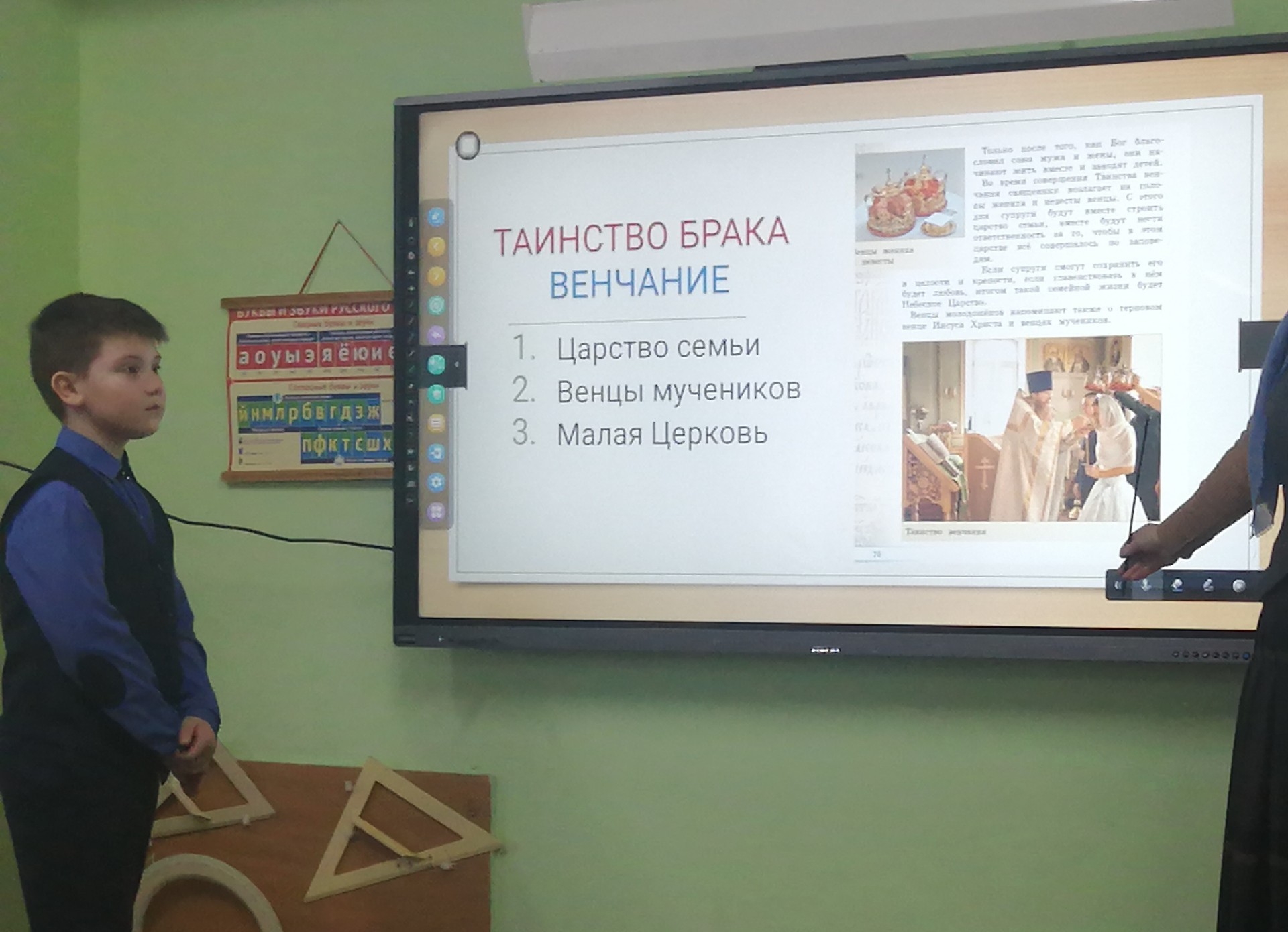 На занятии дети узнали, что семья является удивительным чудом, которое сотворил Господь, и что семья строится на любви и взаимном уважении супругов. Во время совершения Таинства Венчания священник возлагает на головы жениха и невесты венцы. И с одной стророны супруги начинают строить Царство семьи, в котором, подобно Небесному Царству, жизнь должна идти по Заповедям Божиим. С другой стороны - венцы молодоженов напоминают о венцах мучеников, ведь на пути мужа и жены будут не только радости, но и трудности, скорби. Но радость вместе - это двойная радость, а горе вместе - это горе пополам.